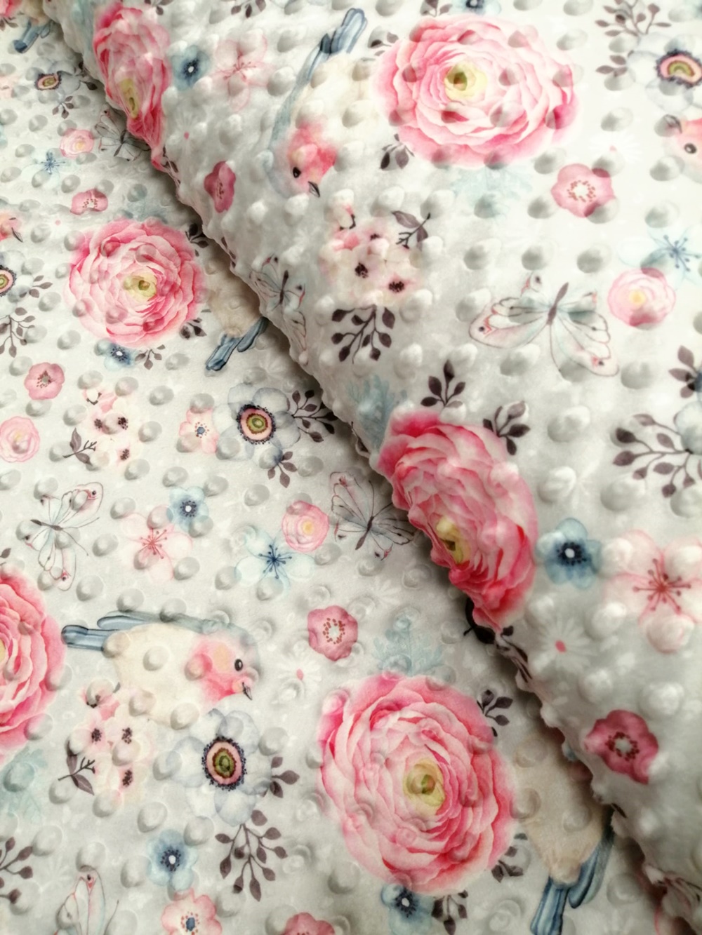 Velmi jemný heboučký materiál s prolisy, které vytvářejí plastické puntíky. Využití na deky, zavinovačky, župany, hnízdečka, pelíšky, čepice, nákrčníky, hračky, sedací vaky a ostatní.